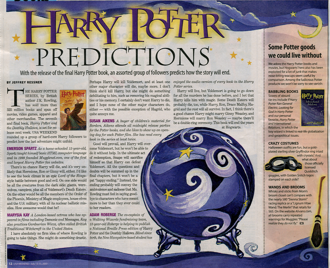 In USA Weekend’s July 13-15th issue there is an article called Harry Potter Predictions. They ask some important people what they think will happen in the end. Emerson Spartz from Mugglenet is one of the people they asked.