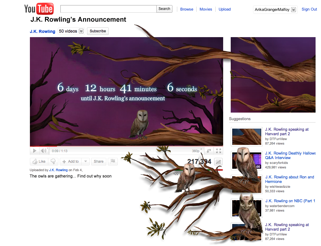The Pottermore website has been updated to reveal two owls sitting on trees. Upon clicking these owls you are taken to an interactive Youtube page which you can see here, a screenshot is below since the video isn’t embedable. he