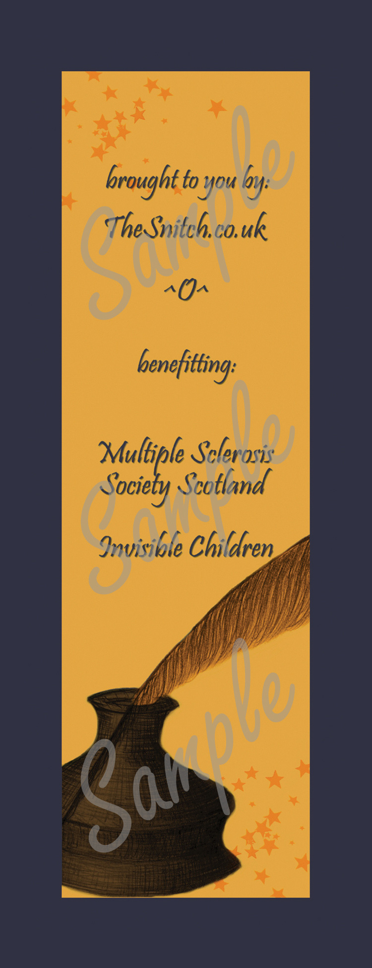 TheSnitch.co.uk has asked my help in their charity, Bookmarks with Benifits. They will be donating the proceeds to the Multiple Sclerosis Society of Scotland and Invisible Children. I encourage everyone to buy a bookmark to help raise money for these charities!